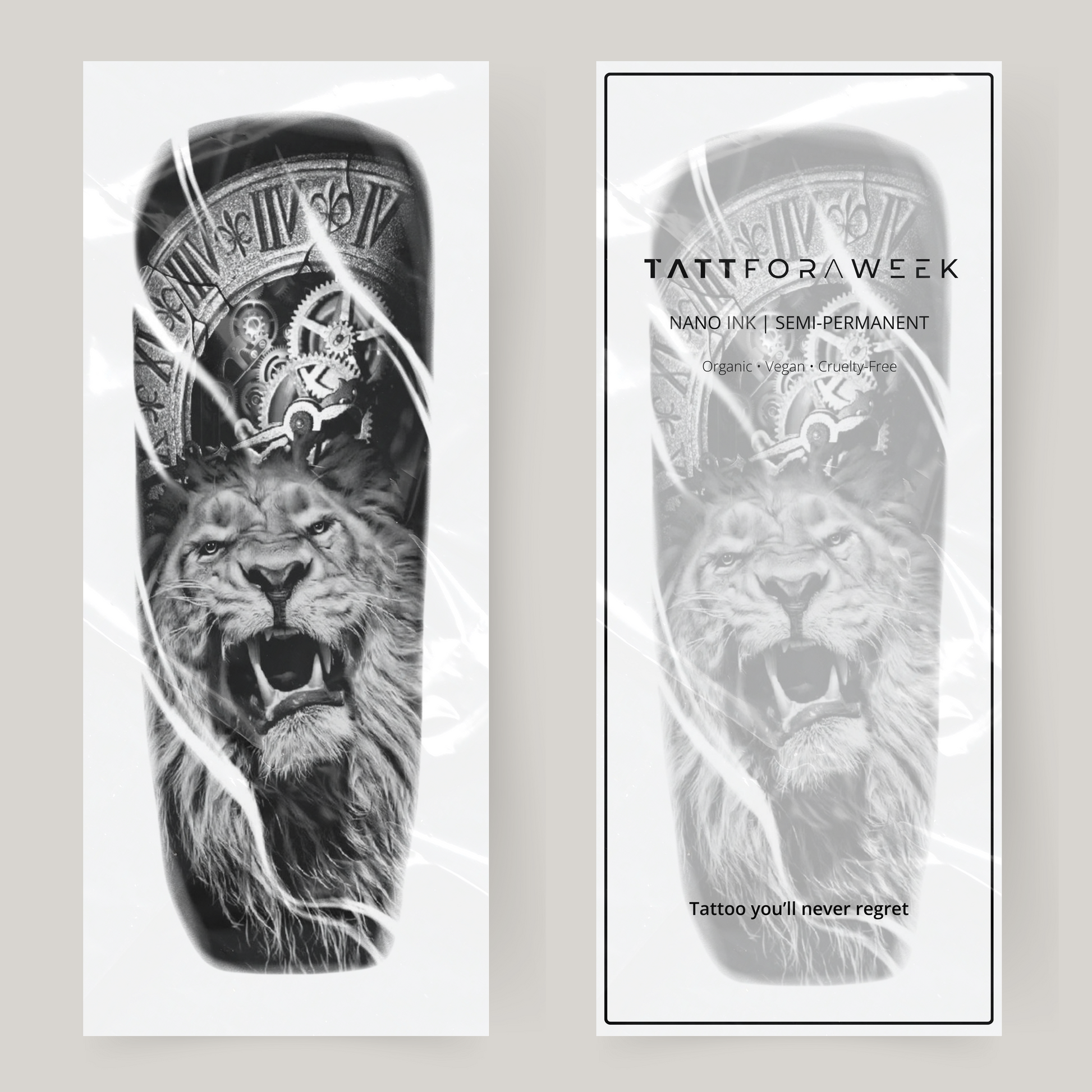 Falske tatoveringsærmer brølende løve & ur